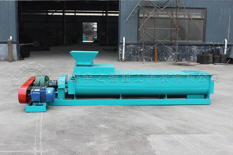 The double axis mixer is rotated through two groups of screw shafts with spiral blade, and water is added water to the powder material for spraying wet mixing transportation, so that powdery material can achieve controllable humidity. The equipment is mainly suitable for humidification and mixing of raw materials in the fertilizer industry, so that the materials are fully mixing and this machine have the function of conveying too. When the quantity of raw material is poured into the mixing tank from the outlet, the raw material is atomized by a number of water with relative pressure, which is stirred by the mixing shaft of the qualitative length to form a uniform water-containing core. The whole agitation is divided into three areas: atomization area, mixing area and discharge area. The agitator leaves have well wear resistance and long service life.
